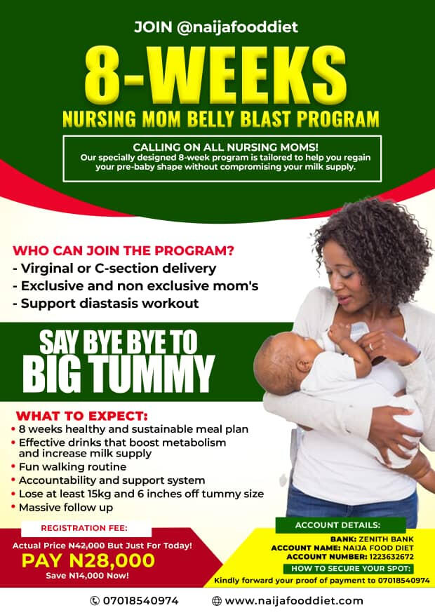 This is an Exclusive Program for Nursing Mothers that want to say bye bye to big tummy and welcome to attractive tummy!The program is designed with you in mind...Taking care of a baby is already a difficult task. Thus, this program is Easy, Simple, and Fun to follow through.This is what Mrs Igwe Ann a practicing lawyer has to say after joining the program...